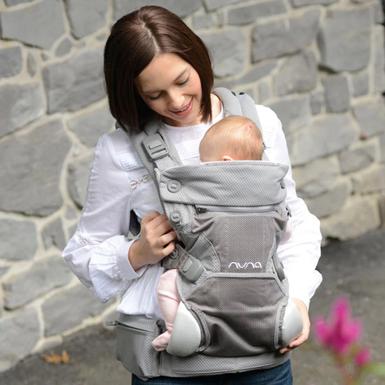 This baby carrier from Nuna is comfortable and customizable with breathable mesh fabric. Also features padded shoulder and waist straps for added comfort while baby wearing. Keep baby facing in and snuggled up starting with an integrated infant booster for newborns, which then easily unzips as your child grows.
