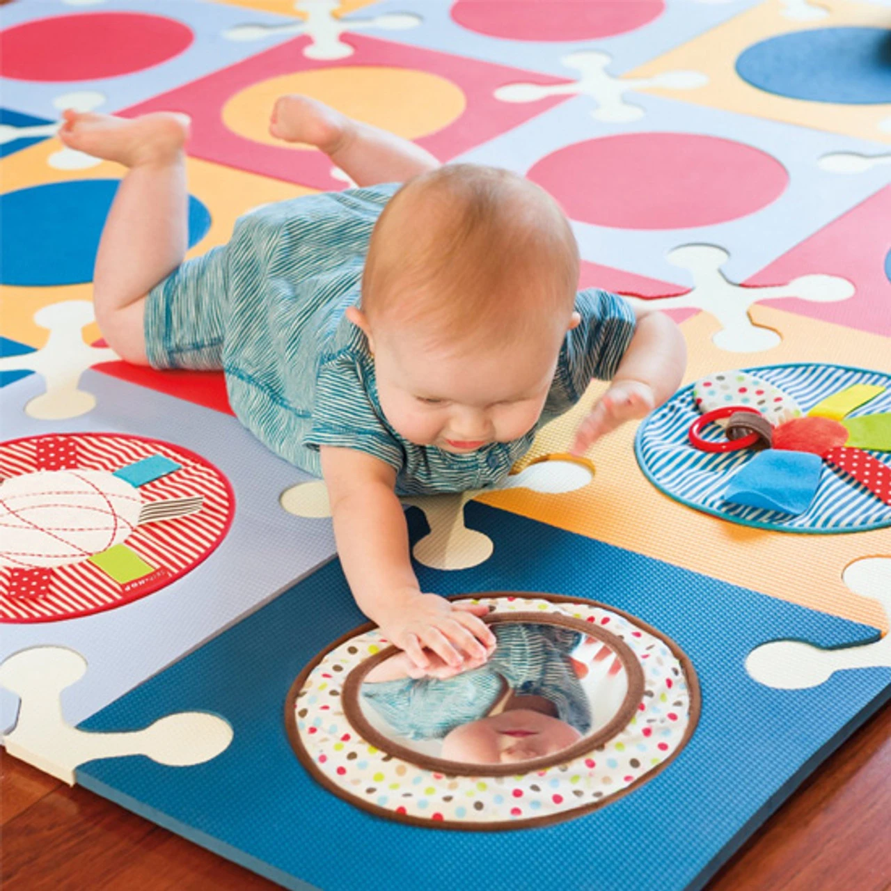 Skip Hop’s Playspot turns into an activity center. Just remove the solid interior and insert these fun circles featuring tactile ribbons, squeaker, mirror, teethers and crinkle leaf. (Playspot Foam Tiles sold separately)
