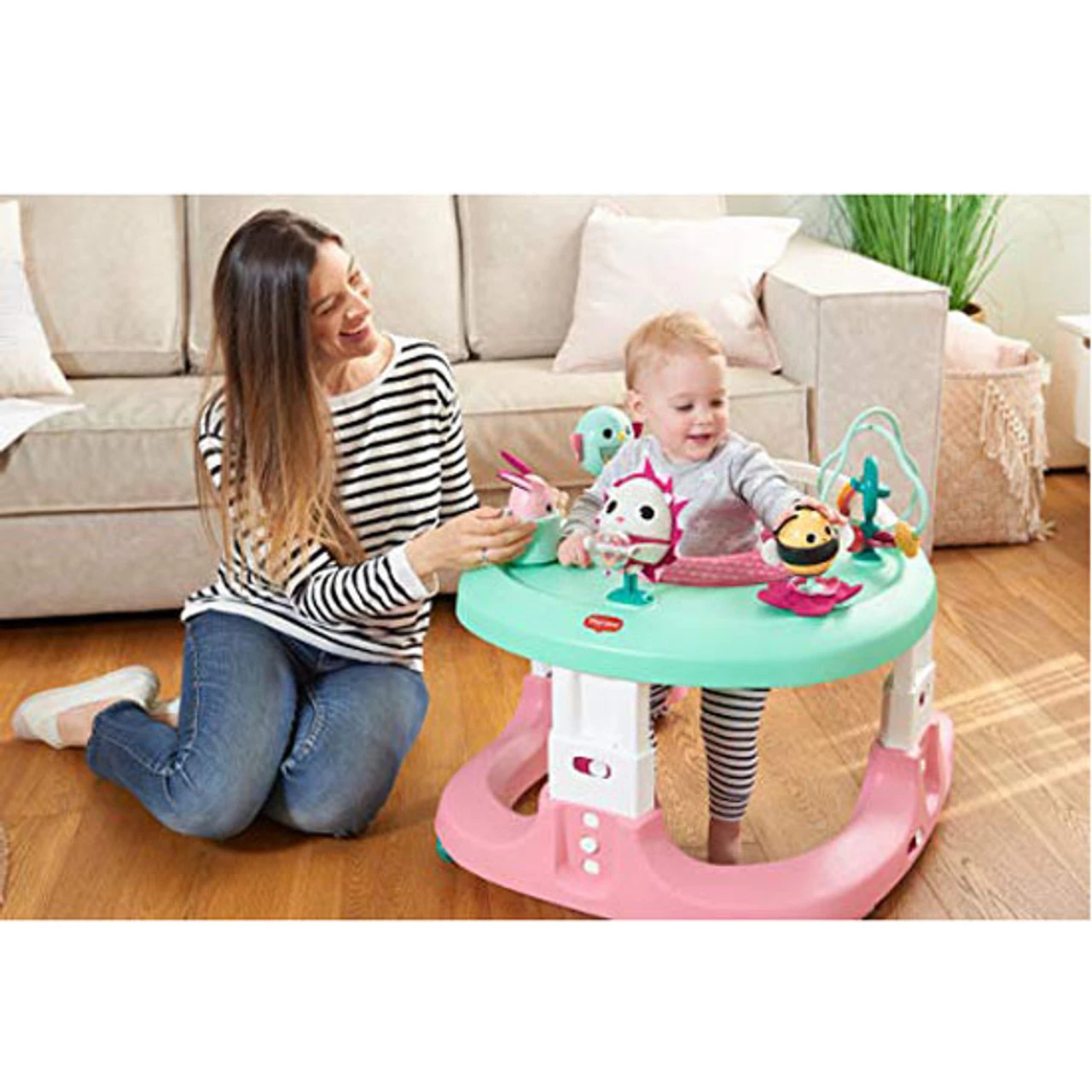 As baby becomes more active around 6 months, bouncing in jumper mode provides baby with plenty of exercise to strengthen leg, back and neck muscles.