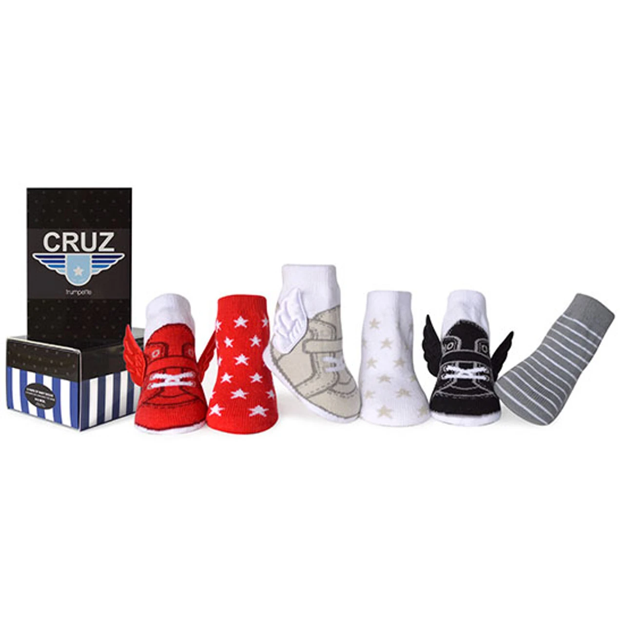 Let them be free to fly in our Cruz socks. Three pairs of low-top shoe socks with wings on each side of the shoes and three pairs of socks with a pattern to them. All packaged in a gift box.