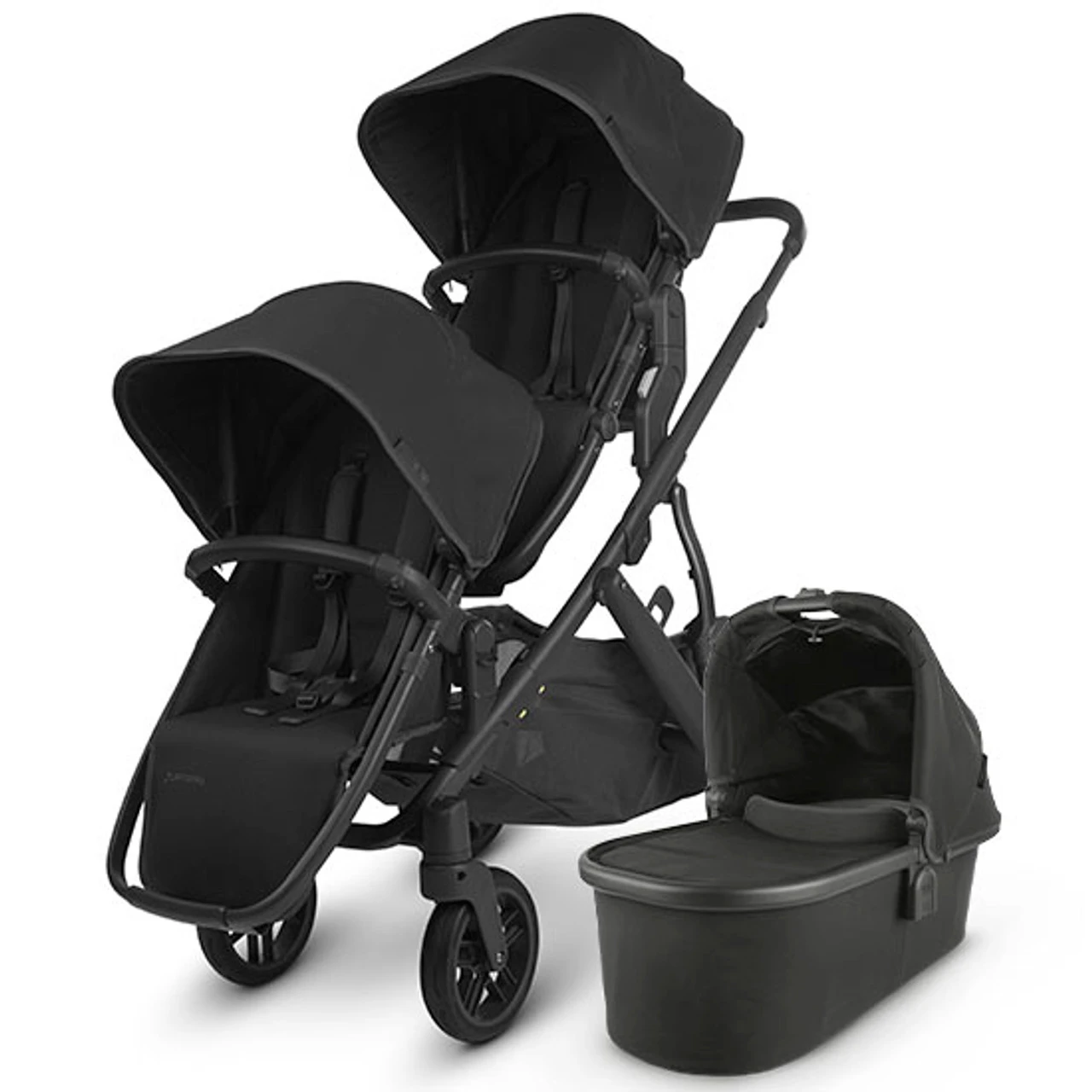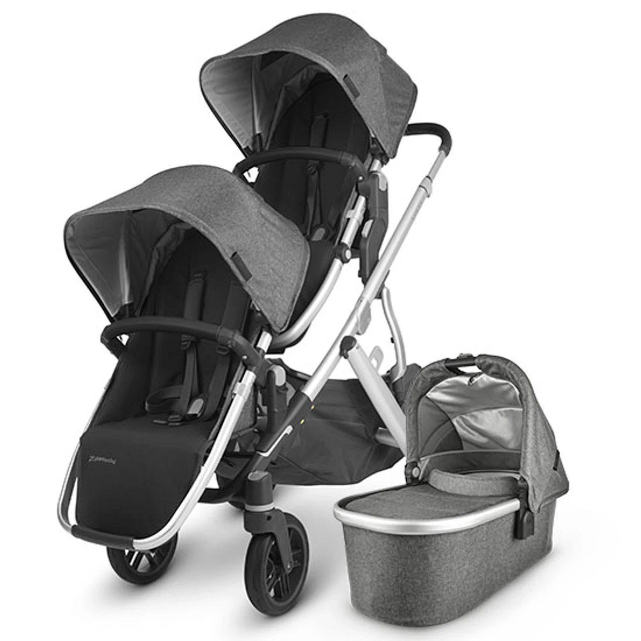 The number one stroller in its class, the Uppbaby VistaV2 stroller is available in a double stroller configuration. Use the included bassinet with a second seat, or two seats at one.